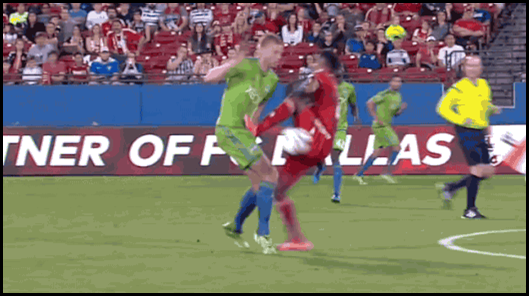 Kellyn Acosta, filling in at left back for starter Moises Hernandez (int’l duty, Guatemala), got his first start of the season and the opportunity to show coach Pareja that he deserves a spot in Dallas’ starting XI. He played an uneventful 17 minutes before a horribly timed challenge found his boot firmly in the stomach of poor Andy Rose (see below). Kellyn will want that challenge back as it cost him 73 minutes to showcase his value to the team and quite possibly cost Dallas two points (Seattle and Dallas played to a 0-0 draw).