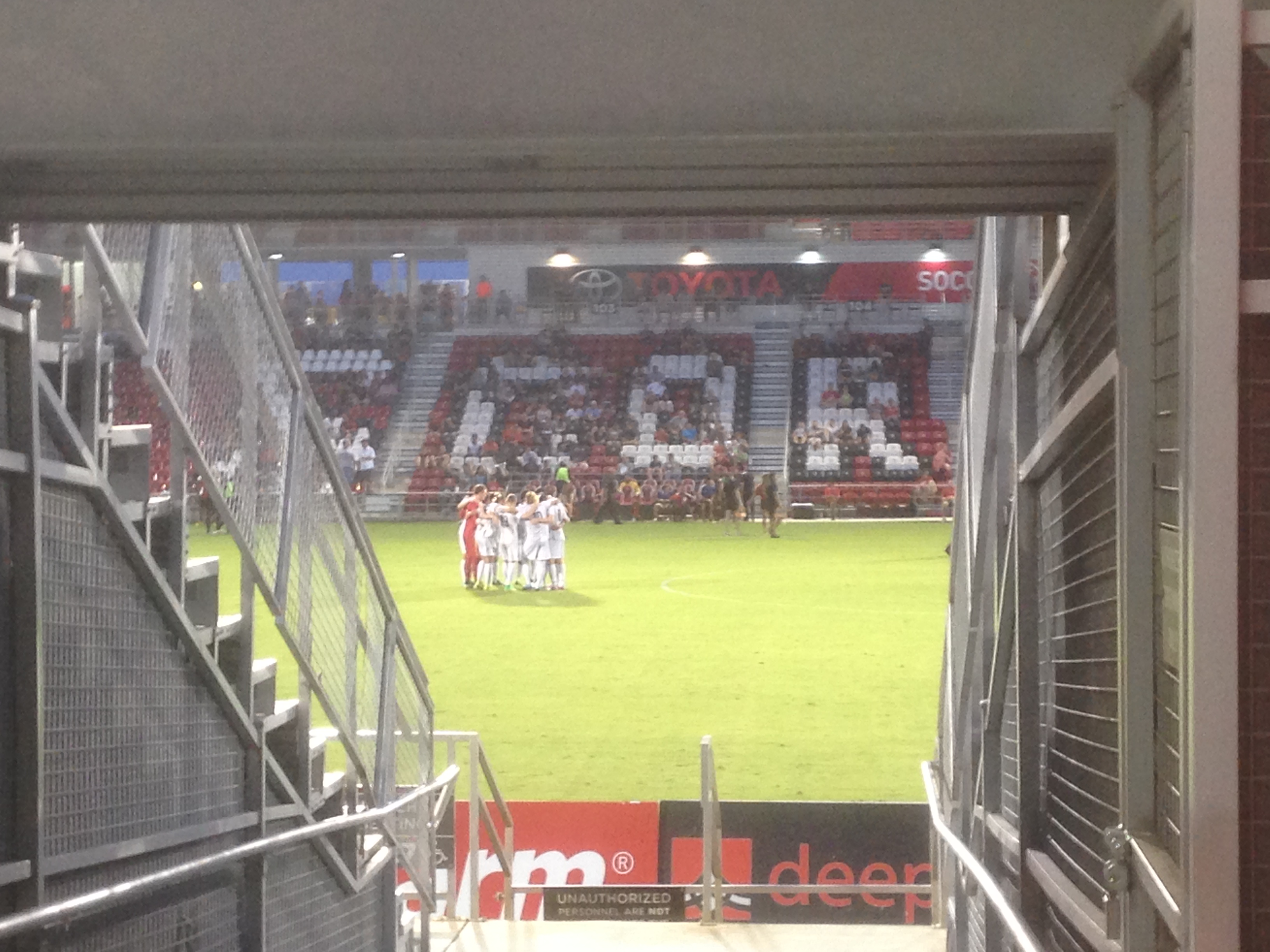 As expected, few fans were in attendance at Toyota Field, a brilliant and inviting venue worthy of housing an MLS side. As an Aztex season ticket holder, it was nice watching the boys on a proper soccer pitch, a wide, all natural surface (Austin’s home pitch is a narrow turf surface with football lines on it). The Aztex have some nice attacking talent and dangerous wing men, so the Toyota Field pitch really lent itself to our style of play and we looked much sharper than usual. I thought Austin was stronger than SA in the first half with the best chance for either team coming on a Kris Tyrpak break where he failed to get the shot off. Despite the strong first half effort from Austin, the match was scoreless after 45.