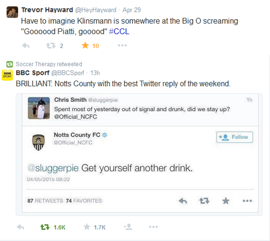 But the tweet below Hayward’s is the official week 9 TOTW. @BBCSporf deserves credit for spotting it, but the distinction is awarded to the Notts County FC social media team for their perfect response to a fan’s inquiry.