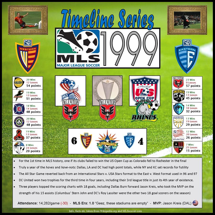 There are some weird point totals in the table – like, why do the Rapids only have 48 points if they won 20 matches? Remember, draws were settled with shootouts, which netted the winning club one point rather than three. The 1999 season was the last in which MLS used shootouts to determine the outcome of draws as, the following year, the league adopted the standard W/L/D system most soccer fans are familiar with.
