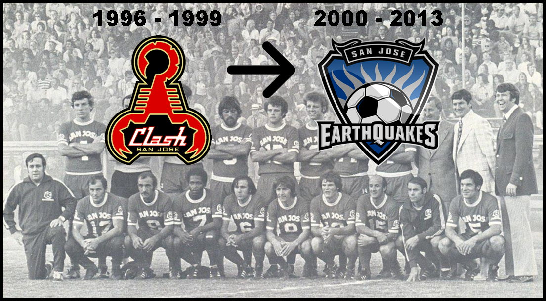 Re-brand! Soccer Therapy loves re-brands, the good ones and the bad ones, so they’ll be featured heavily throughout this series. In 2000, San Jose killed the Clash and reincarnated the EarthQuakes from their old NASL days dating back to the 70s. The picture below is a team photo from one of those 70s squads with some info about the club’s logo usage during their first 18 years in MLS.